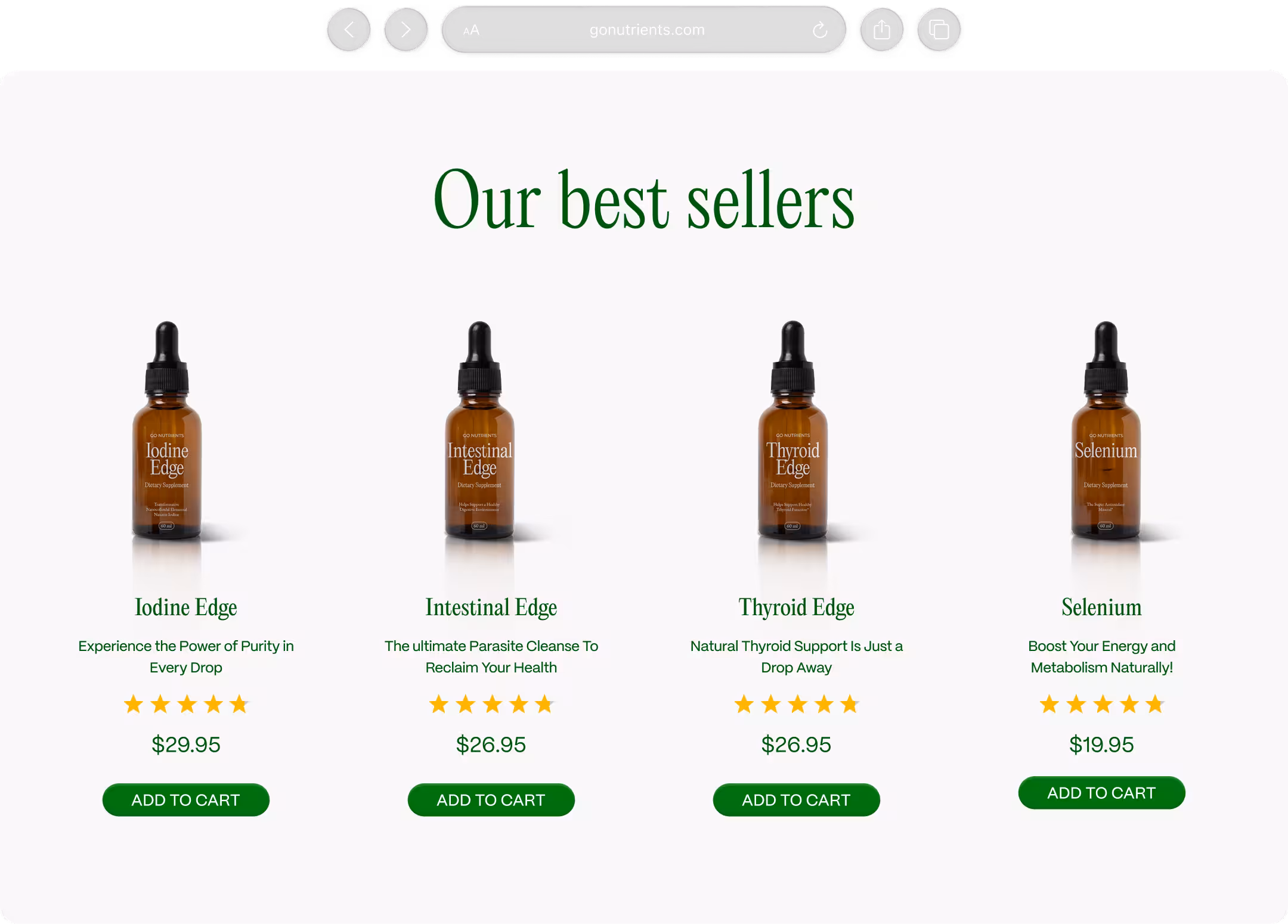 We refreshed Go Nutrients brand with a vibrant palette anchored by green and a bold serif typeface. The user-friendly site boosts supplement sales, aligns with their mission, and fosters meaningful audience connections through a modern digital experience.